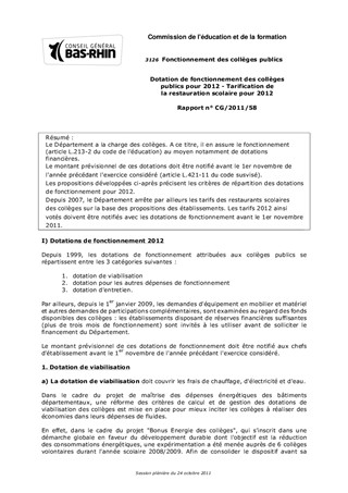 Le Département a la charge des collèges. A ce titre, il en assure le fonctionnement (article L.213-2 du code de l'éducation) au moyen notamment de dotations financières. Le montant prévisionnel de ces dotations doit être notifié avant le 1er novembre de l'année précédant l'exercice considéré (article L.421-11 du code susvisé). Les propositions développées ci-après précisent les critères de répartition des dotations de fonctionnement pour 2012. Depuis 2007, le Département arrête par ailleurs les tarifs des restaurants scolaires des collèges sur la base des propositions des établissements. Les tarifs 2012 ainsi votés doivent être notifiés avec les dotations de fonctionnement avant le 1er novembre 2011.
