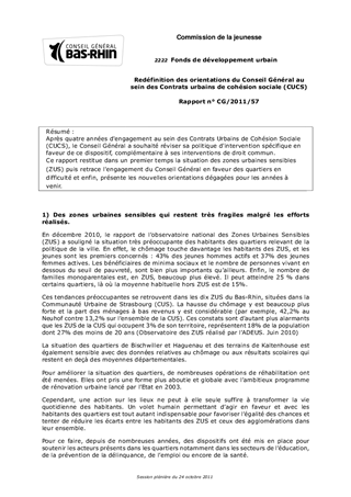 Après quatre années d'engagement au sein des Contrats Urbains de Cohésion Sociale (CUCS), le Conseil Général a souhaité réviser sa politique d'intervention spécifique en faveur de ce dispositif, complémentaire à ses interventions de droit commun. Ce rapport restitue dans un premier temps la situation des zones urbaines sensibles (ZUS) puis retrace l'engagement du Conseil Général en faveur des quartiers en difficulté et enfin, présente les nouvelles orientations dégagées pour les années à venir.