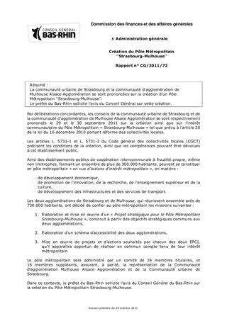 La communauté urbaine de Strasbourg et la communauté d'agglomération de Mulhouse Alsace Agglomération se sont prononcées sur la création d'un Pôle Métropolitain ''Strasbourg-Mulhouse''. Le préfet du Bas-Rhin sollicite l'avis du Conseil Général sur cette création.