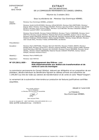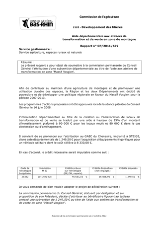 Le présent rapport a pour objet de soumettre à la commission permanente du Conseil Général l'attribution d'une subvention départementale au titre de l'aide aux ateliers de transformation en zone 'Massif Vosgien'.