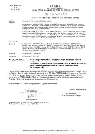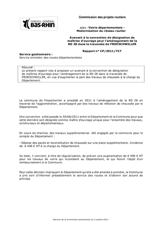 Le présent rapport vise à proposer un avenant à la convention de désignation de maîtrise douvrage pour laménagement de la RD 28 dans la traversée de FROESCHWILLER, en vue d'augmenter la part des travaux de chaussée à la charge du Département.