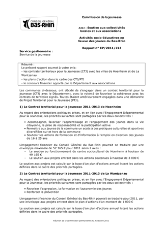 Le présent rapport soumet à votre avis: - les contrats territoriaux pour la jeunesse (CTJ) avec les villes de Hoenheim et de La Wantzenau - les plans d'action dans le cadre des CTJ/PTJ - le concours financier apporté par le Département aux associations