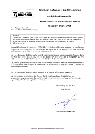 Le présent rapport a pour objet dinformer la commission permanente de la conclusion des marchés publics décrits dans les tableaux joints en annexe, et qui correspondent à la mise en uvre de programmes et dopérations identifiés dans le budget départemental.