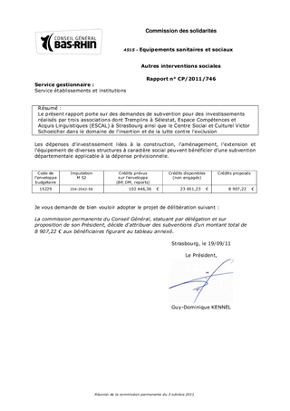 Le présent rapport porte sur des demandes de subvention pour des investissements réalisés par trois associations dont Tremplins à Sélestat, Espace Compétences et Acquis Linguistiques (ESCAL) à Strasbourg ainsi que le Centre Social et Culturel Victor Schoelcher dans le domaine de l'insertion et de la lutte contre l'exclusion