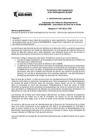 Le présent rapport a pour objet de soumettre à votre approbation lacquisition du local de la Poste situé rue du Cygne à STRASBOURG, intégré dans lopération de lextension de lHôtel du Département.