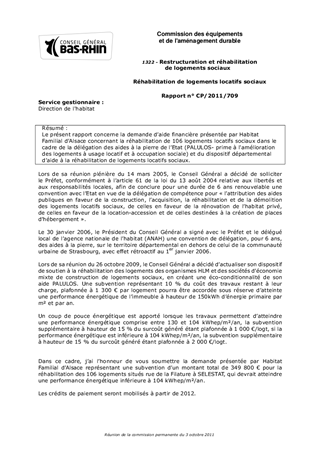 Le présent rapport concerne la demande daide financière présentée par Habitat Familial dAlsace concernant la réhabilitation de 106 logements locatifs sociaux dans le cadre de la délégation des aides à la pierre de lEtat (PALULOS- prime à l'amélioration des logements à usage locatif et à occupation sociale) et du dispositif départemental daide à la réhabilitation de logements locatifs sociaux.