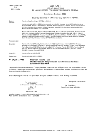 Le présent rapport a pour objet de vous présenter la « Charte pour laccueil des publics en insertion dans les lieux culturels du Bas-Rhin », portée par lassociation Tôt ou TArt. Son objet est de garantir une cohérence et une qualité daccueil des publics du champ social et de linsertion dans lensemble des structures culturelles du Bas-Rhin, elle sinscrit en cohérence avec les priorités affichées dans le Programme Départemental de linsertion voté en juin 2010. Constituant un outil au service des acteurs sociaux et culturels qui sengagent dans cette démarche, elle formalise un engagement à la fois des acteurs de la Culture et des acteurs du Social et facilitera concrètement laccès à la Culture des personnes en parcours dinsertion.