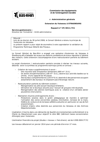 Lors de sa réunion du 28 juillet 2008, le Conseil Général a retenu le principe de lextension du Vaisseau. Le présent rapport a pour objet de soumettre à votre approbation la validation du Programme Technique Détaillé des Travaux.