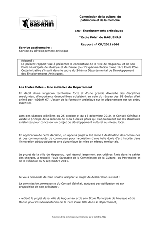 Le présent rapport vise à présenter la candidature de la ville de Haguenau et de son Ecole Municipale de Musique et de Danse pour l'expérimentation d'une 1ère Ecole Pôle. Cette initiative s'inscrit dans le cadre du Schéma Départemental de Développement des Enseignements Artistiques.