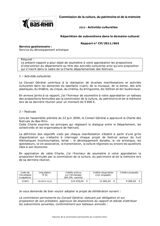 Le présent rapport a pour objet de soumettre à votre approbation les propositions d'intervention du département au titre des activités culturelles ainsi qu'une proposition qui s'inscrit dans le cadre de la Charte départementale des festivals.