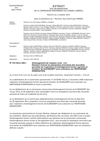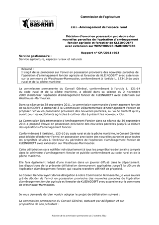 Il sagit de se prononcer sur lenvoi en possession provisoire des nouvelles parcelles de l'opération d'aménagement foncier agricole et forestier de KLEINGOEFT avec extension sur la commune de Westhouse-Marmoutier, conformément à larticle L. 123-10 du code rural et de la pêche maritime