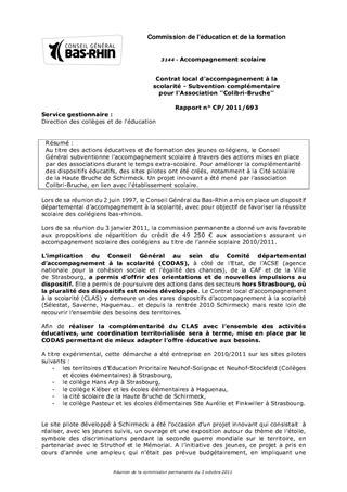 Au titre des actions éducatives et de formation des jeunes collégiens, le Conseil Général subventionne l'accompagnement scolaire à travers des actions mises en place par des associations durant le temps extra-scolaire. Pour améliorer la complémentarité des dispositifs éducatifs, des sites pilotes ont été créés, notamment à la Cité scolaire de la Haute Bruche de Schirmeck. Un projet innovant a été mené par l'association Colibri-Bruche, en lien avec l'établissement scolaire.