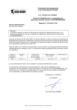 Le présent rapport concerne la demande de subvention départementale pour une étude de faisabilité en vue de la création de logements sociaux dans la comune de SCHOENENBOURG.