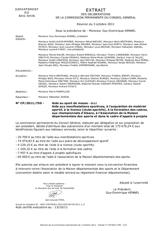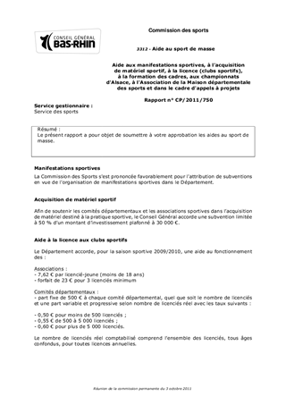 Aide aux manifestations sportives, à l'acquisition de matériel sportif, à la licence (clubs sportifs), à la formation des cadres, aux championnats d'Alsace, à l'Association de la Maison départementale des sports et dans le cadre d'appels à projets