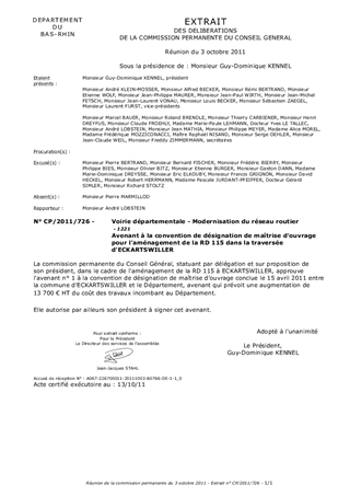 Le présent rapport vise à proposer un avenant à la convention de désignation de maîtrise douvrage pour laménagement de la RD 115 dans la traversée d'ECKARTSWILLER, en vue d'augmenter la part des travaux de chaussée à la charge du Département.