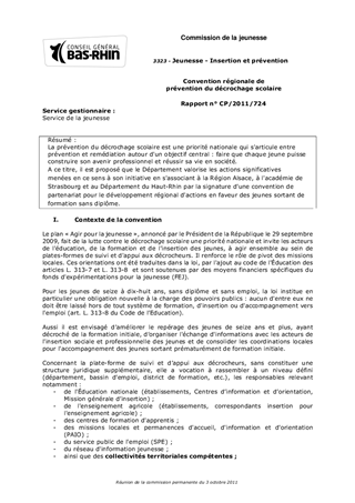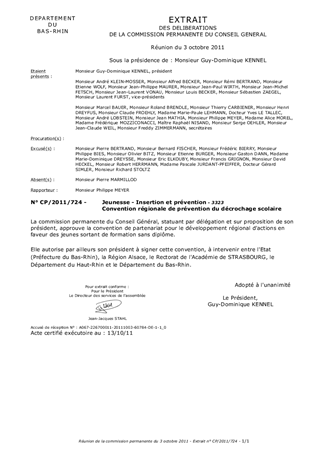 La prévention du décrochage scolaire est une priorité nationale qui s'articule entre prévention et remédiation autour d'un objectif central : faire que chaque jeune puisse construire son avenir professionnel et réussir sa vie en société. A ce titre, il est proposé que le Département valorise les actions significatives menées en ce sens à son initiative en s'associant à la Région Alsace, à l'académie de Strasbourg et au Département du Haut-Rhin par la signature d'une convention de partenariat pour le développement régional d'actions en faveur des jeunes sortant de formation sans diplôme.