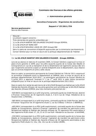 Le présent rapport concerne : Trois demandes de garantie présentées par : 1) la SA dHLM HABITAT DES SALARIES DALSACE-Groupe DOMIAL 2) la SA dHLM ICF NORD-EST 3) la SA dHLM NOUVEAU LOGIS DE LESTGroupe SNI dans le cadre de conventions dobjectifs approuvées par la commission permanente du Conseil Général pour la mise en uvre de la politique départementale de lhabitat