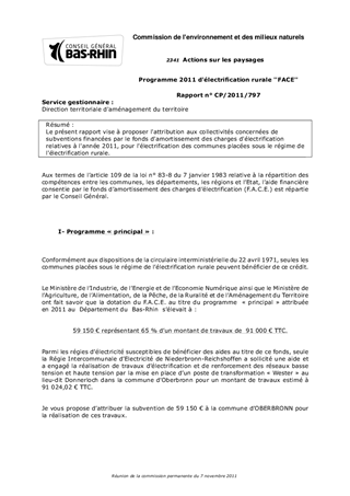 Le présent rapport vise à proposer l'attribution aux collectivités concernées de subventions financées par le fonds d'amortissement des charges d'électrification relatives à l'année 2011, pour l'électrification des communes placées sous le régime de l'électrification rurale.