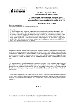 Le Département peut autoriser dautres collectivités à effectuer des travaux sur son domaine public routier. Ces collectivités, communes ou communautés de communes en général, peuvent bénéficier des attributions du fonds de compensation pour la taxe sur la valeur ajoutée (FCTVA) pour les investissements réalisés sur le domaine public dune autre collectivité à condition de passer une convention tel que prévu par le code général des collectivités territoriales. Les conventions à passer à ce titre sont bâties à partir dun modèle-type joint au rapport.