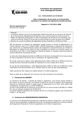 Le présent rapport concerne les demandes daide financière de la commune de Hoerdt, de la commune de Wangenbourg-Engenthal, de la communauté de communes de la Région de Molsheim-Mutzig pour la mise à disposition de terrains ou d'immeubles, par vente au profit de lOpus 67 et par bail ou acte dachat au profit du Foyer de la Basse Bruche, en vue de la création de logements sociaux financés en PLUS et en PLAI.