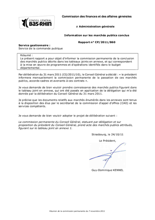 Le présent rapport a pour objet dinformer la commission permanente de la conclusion des marchés publics décrits dans les tableaux joints en annexe, et qui correspondent à la mise en uvre de programmes et dopérations identifiés dans le budget départemental.