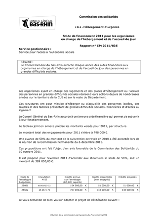 Solde de financement 2011 pour les organismes en charge de l'hébergement et de l'accueil de jour