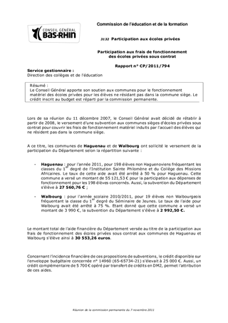 Le Conseil Général apporte son soutien aux communes pour le fonctionnement matériel des écoles privées pour les élèves ne résidant pas dans la commune siège. Le crédit inscrit au budget est réparti par la commission permanente.