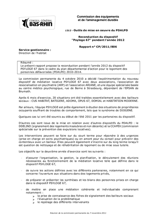 Le présent rapport propose la reconduction pendant l'année 2012 du dispositif PSYLOGE 67 dans le cadre du plan départemental daction pour le logement des personnes défavorisées (PDALPD) 2010-2014.