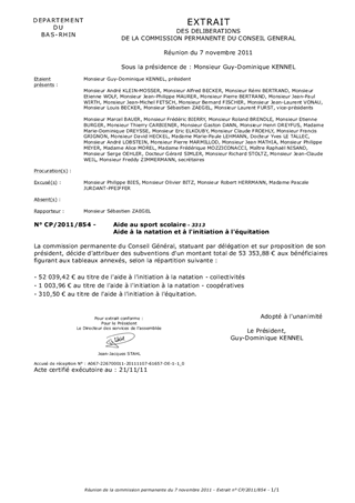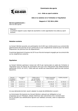 Aide à la natation et à l'initiation à l'équitation Resumé Le présent rapport a pour objet de soumettre à votre approbation les aides au sport scolaire. Pièces jointes Délibération Rapport Assemblée : Commission Permanente Date : 07/11/2011 Rapporteur : Monsieur Sébastien ZAEGEL Collectivité : Conseil départemental du Bas-Rhin Direction : Direction de la jeunesse et des sports Service : Service des sports Domaine : Non renseigné Commission : K - Commission des sports