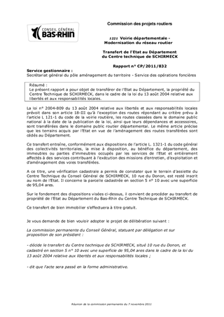Le présent rapport a pour objet de transférer de lEtat au Département, la propriété du Centre Technique de SCHIRMECK, dans le cadre de la loi du 13 août 2004 relative aux libertés et aux responsabilités locales.