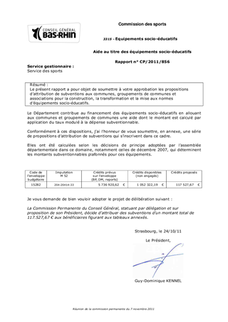 Le présent rapport a pour objet de soumettre à votre approbation les propositions dattribution de subventions aux communes, groupements de communes et associations pour la construction, la transformation et la mise aux normes déquipements socio-éducatifs.