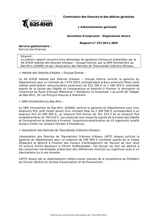 Le présent rapport concerne trois demandes de garanties demprunt présentées par la SA dHLM Habitat des Salariés dAlsace  Groupe Domial, par la SEM Immobilière du Bas-Rhin (SIBAR) et par lAssociation des Familles de Traumatisés Crâniens dAlsace.