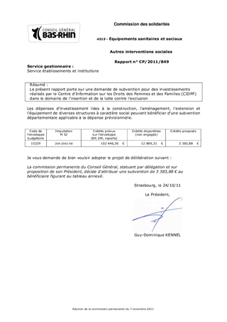 Le présent rapport porte sur une demande de subvention pour des investissements réalisés par le Centre d'Information sur les Droits des Femmes et des Familles (CIDFF) dans le domaine de l'insertion et de la lutte contre l'exclusion