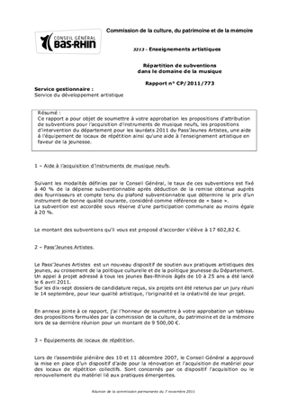 Ce rapport a pour objet de soumettre à votre approbation les propositions d'attribution de subventions pour l'acquisition d'instruments de musique neufs, les propositions d'intervention du département pour les lauréats 2011 du Pass'Jeunes Artistes, une aide à l'équipement de locaux de répétition ainsi qu'une aide à l'enseignement artistique en faveur de la jeunesse.