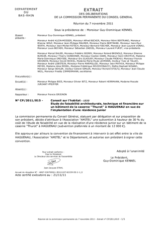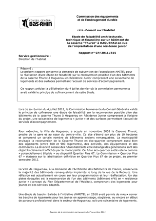Le présent rapport concerne la demande de subvention de l'association AMITEL pour la réalisation d'une étude de faisabilité sur la reconversion possible d'un des bâtiments de la caserne Thurot à Haguenau en Résidence Junior comprenant une soixantaine de logements et des surfaces permettant l'accueil de services d'accompagnement. Ce rapport précise la délibération du 4 juillet dernier où la commission permanente avait validé le principe de cofinancement de cette étude.