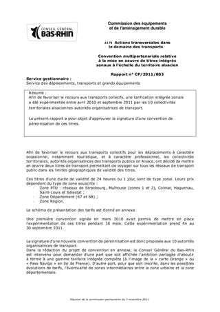 Afin de favoriser le recours aux transports collecifs, une tarification intégrée zonale a été expérimentée entre avril 2010 et septembre 2011 par les 10 collectivités territoriales alsaciennes autorités organisatrices de transport. Le présent rapport a pour objet d'approuver la signature d'une convention de pérennisation de ces titres.