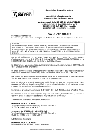 Le présent rapport a pour objet d'une part, de demander l'ouverture de l'enquête parcellaire, et d'autre part, de soumettre à votre approbation les modalités d'indemnisation des acquisitions foncières nécessaires aux travaux d'aménagement de la RD 133-14 à BOUXWILLER, GRIESBACH-LE-BASTBERG et à DOSSENHEIM SUR ZINSEL.