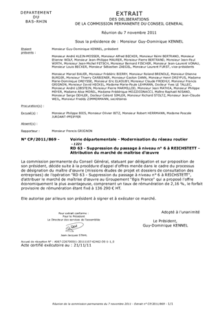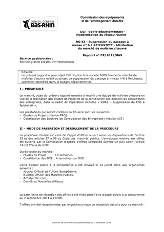 Le présent rapport a pour objet l'attribution à la société EGIS France du marché de maîtrise d'uvre relatif au projet de suppression du passage à niveau n°6 à Reichstett, opération identifiée dans le budget départemental.