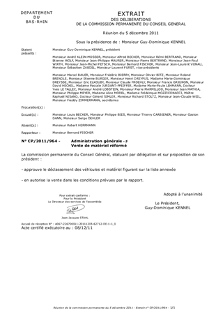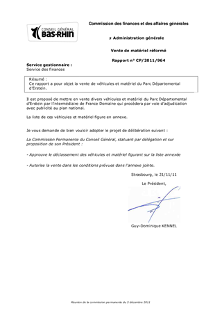 Vente de matériel réformé Resumé Ce rapport a pour objet la vente de véhicules et matériel du Parc Départemental d'Erstein. Pièces jointes Délibération Rapport Assemblée : Commission Permanente Date : 05/12/2011 Rapporteur : Monsieur Bernard FISCHER Collectivité : Conseil départemental du Bas-Rhin Direction : Direction des finances et de la commande publique Service : Service des finances Domaine : Non renseigné Commission : M - Commission des finances et des affaires générales