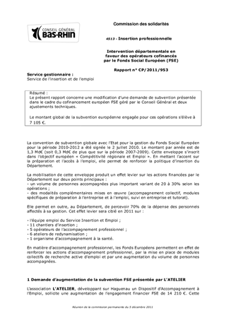 Le présent rapport concerne une modification dune demande de subvention présentée dans le cadre du cofinancement européen FSE géré par le Conseil Général et deux ajustements techniques. Le montant global de la subvention européenne engagée pour ces opérations sélève à 7 105 €.