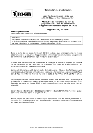 Le présent rapport vise à proposer ladoption dun nouveau programme daménagement de routes départementales en traverses dagglomération (subventions de type « bordures et caniveaux » - dossier déposé en 2010).