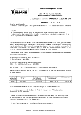 Le présent rapport a pour objet de soumettre à votre approbation les modalités dindemnisation dune acquisition foncière nécessaire au projet daménagement de la route départementale n° 104 à HATTEN
