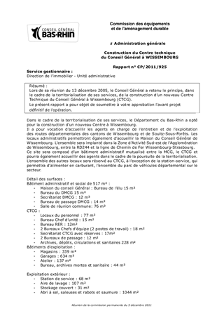 Lors de sa réunion du 13 décembre 2005, le Conseil Général a retenu le principe, dans le cadre de la territorialisation de ses services, de la construction dun nouveau Centre Technique du Conseil Général à Wissembourg (CTCG). Le présent rapport a pour objet de soumettre à votre approbation l'avant projet définitif de l'opération.