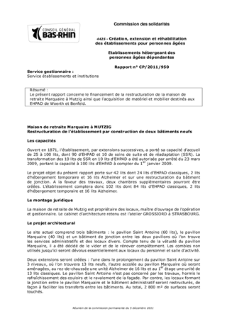 Le présent rapport concerne le financement de la restructuration de la maison de retraite Marquaire à Mutzig ainsi que l'acquisition de matériel et mobilier destinés aux EHPAD de Woerth et Benfeld.