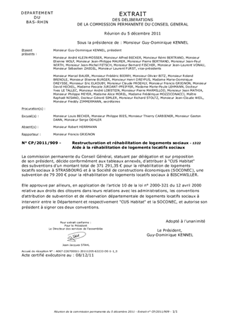 Le présent rapport concerne les demandes daides financières présentées par la SOCONEC concernant la réhabilitation de 24 logements locatifs sociaux et par CUS HABITAT concernant la réhabilitation et l'adaptation de logements locatifs sociaux sur le territoire de la communuaté urbaine de Strasbourg, dans le cadre du dispositif départemental daide à la réhabilitation de logements locatifs sociaux et dans le cadre des conventions ANRU signées antérieurement au 1er janvier 2010. A ce titre, 5 dossiers relatifs à des opérations éligibles à la Prime pour lAmélioration des Logements à Usage Locatif et à Occupation Sociale (PALULOS) sont présentés dans les annexes au rapport.