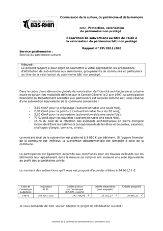 Le présent rapport a pour objet de soumettre à votre approbation les propositions dattribution de subventions aux communes, groupements de communes et particuliers au titre de la valorisation du patrimoine bâti non protégé.