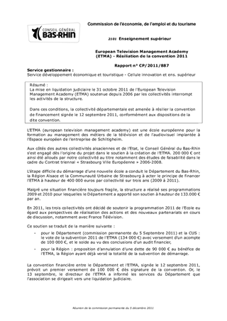 La mise en liquidation judiciaire le 31 octobre 2011 de l'European Television Management Academy (ETMA) soutenue depuis 2006 par les collectivités interrompt les activités de la structure. Dans ces conditions, la collectivité départementale est amenée à résilier la convention de financement signée le 12 septembre 2011, conformément aux dispositions de la dite convention.