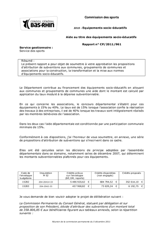 Le présent rapport a pour objet de soumettre à votre approbation les propositions dattribution de subventions aux communes, groupements de communes et associations pour la construction, la transformation et la mise aux normes déquipements socio-éducatifs.