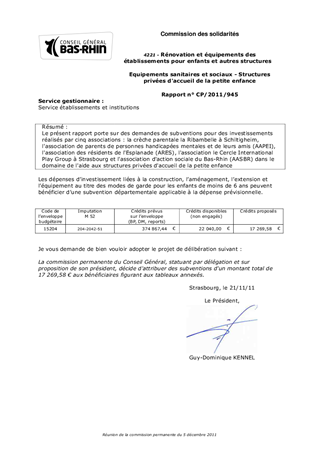 Le présent rapport porte sur des demandes de subventions pour des investissements réalisés par cinq associations : la crèche parentale la Ribambelle à Schiltigheim, l'association de parents de personnes handicapées mentales et de leurs amis (AAPEI), l'association des résidents de l'Esplanade (ARES), l'association le Cercle International Play Group à Strasbourg et l'association d'action sociale du Bas-Rhin (AASBR) dans le domaine de l'aide aux structures privées d'accueil de la petite enfance