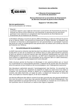 Le présent rapport a pour objet de renouveler la convention de financement du Service dAccueil du Jeune et de la Famille en vue dautoriser la poursuite de son activité et participer à son extension en complément des financements du Fond National de Financement de la Protection de lEnfance.